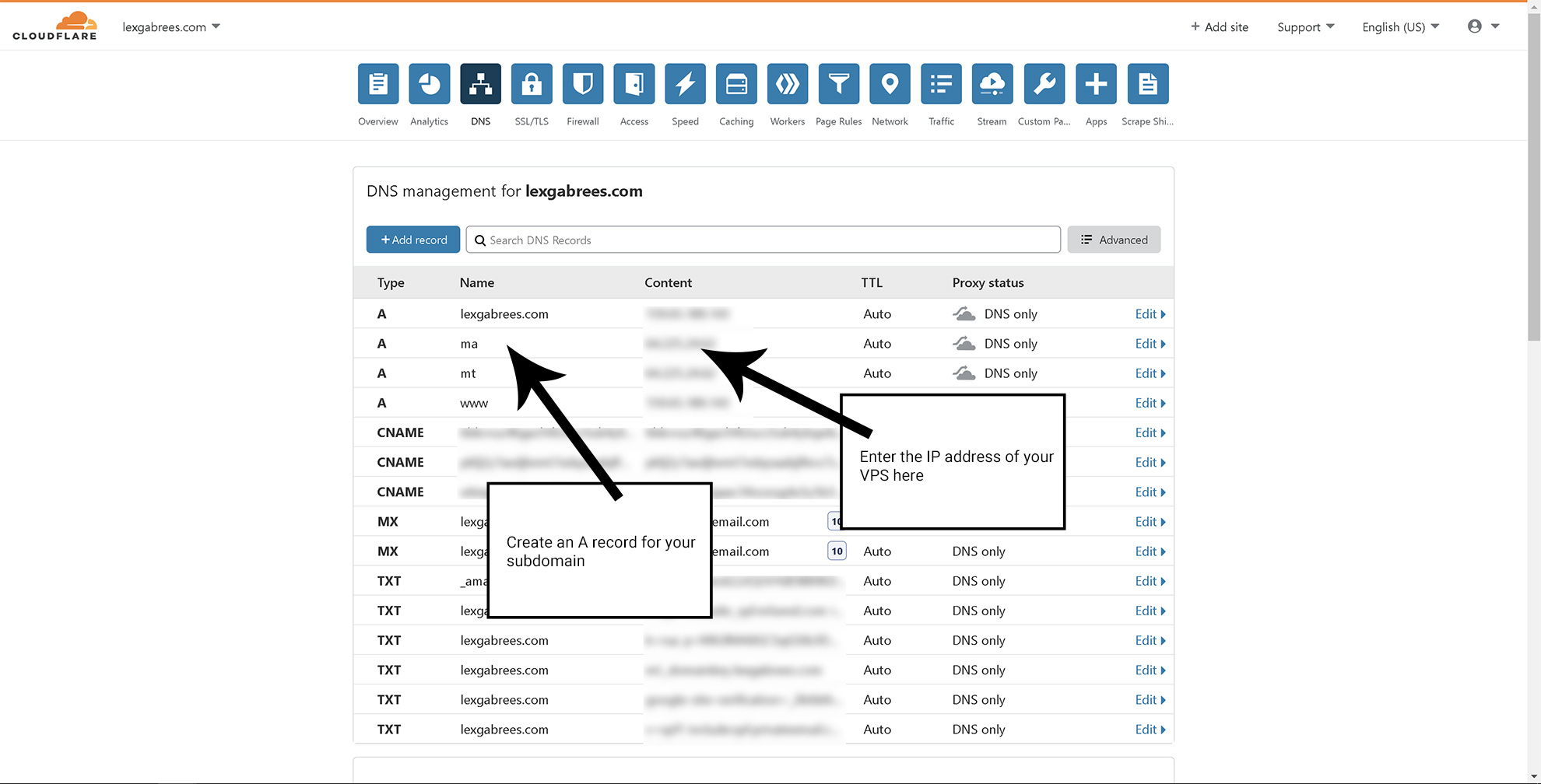 In order to make this happen, log in to your DNS provider and create an A record for the subdomain you’ll be using to install Mautic on. For example, here I am using Cloudflare DNS and I’ve created an A record for my Mautic installation.