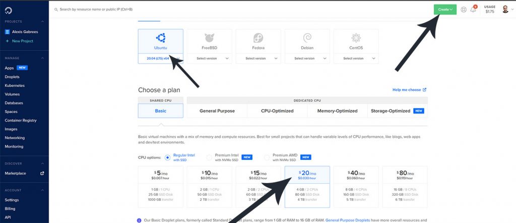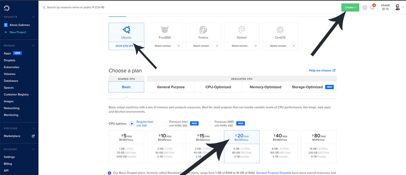 - Create a droplet (server) with Ubuntu 20.04 LTS and choose at least a 20 USD / month server.